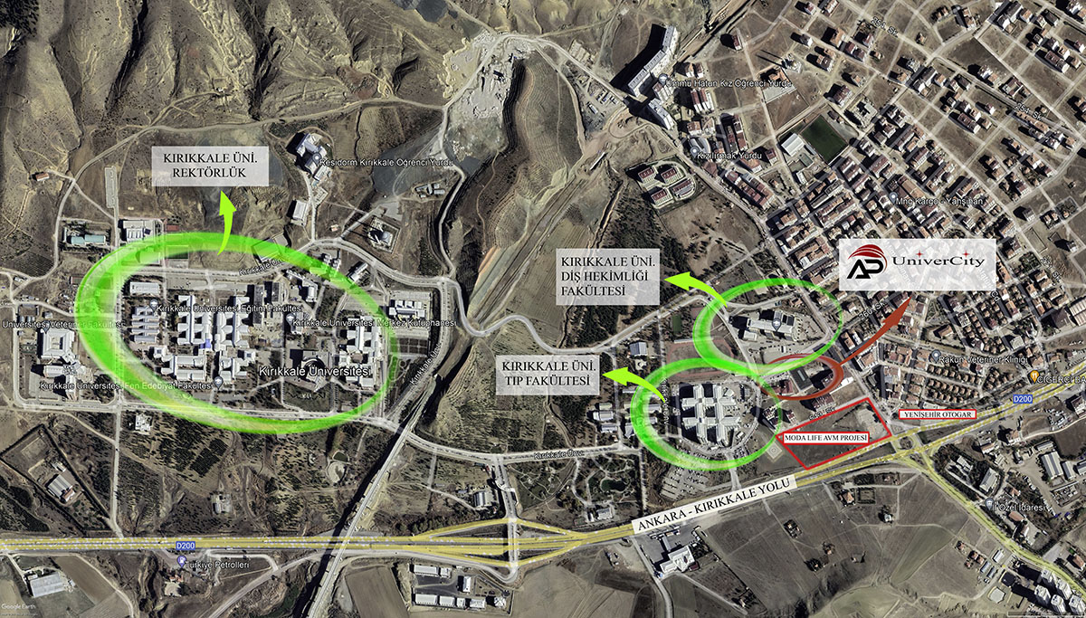 AP Univercity Projesi, Kırıkkale Üniversitesi Rektörlük yerleşkesinin girişinde, Tıp Fakültesi ve Diş Hekimliği Fakültesi'nin sadece 30 metre ilerisinde, köşe başında merkezi bir konumda bulunuyor. 2000 m² arsa üzerine kurulan bu proje, 11.000 m² kapalı alanıyla büyük ilgi çeki